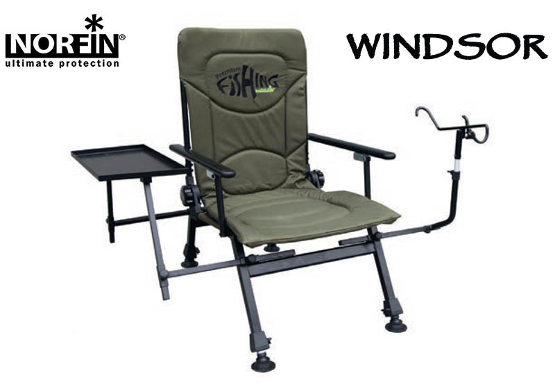 Η συγκεκριμένη καρέκλα της Norfin  έχει ονομασία "WINDSOR", είναι κατασκευασμένη από αλουμίνιο, με αποτέλεσμα να είναι αρκετά ελαφριά σε σχέση πάντα με το μέγεθος της. Μπορεί να συναρμολογηθεί εύκολα στον χώρο που έχουμε επιλέξει να ψαρέψουμε. Διαθέτει δεξιά κι αριστερά στηρίγματα για τα χέρια μας. Επίσης είναι εφοδιασμένη με δύο έξτρα προσθήκες που αν θελήσουμε μπορούμε να τοποθετήσουμε δεξιά κι αριστερά της καρέκλας. Η μία είναι ένα τετράγωνο αλουμίνιο που έχει ως σκοπό την διευκόλυνση μας στο να διολώσουμε τις αρματωσιές μας έχοντας εκεί πάνω απλωμένα τα δολώματα μας και οτιδήποτε άλλο χρειαζόμαστε άμεσα στο ψάρεμα μας. Η δεύτερη είναι μία προσθήκη που λειτουργεί ως βάση του καλαμιού μας. Τέλος διαθέτει ρυθμιζόμενη πλάτη.