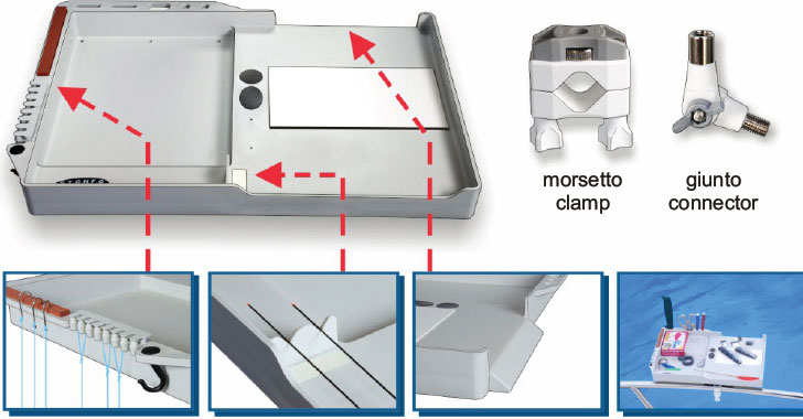 • Η βάση διαθέτει θήκες για κουτάκια δολωμάτων, φελλό για αγκίστρια, υποδοχές για παράμμαλα, σκληρό μέρος για κόψιμο δολωμάτων,μαγνητάκια για αγκίστρια ή μεταλικά rigs, καθώς και μέρη για το ψαλιδάκι την βελόνα ή τον απαγκιστρωτή!